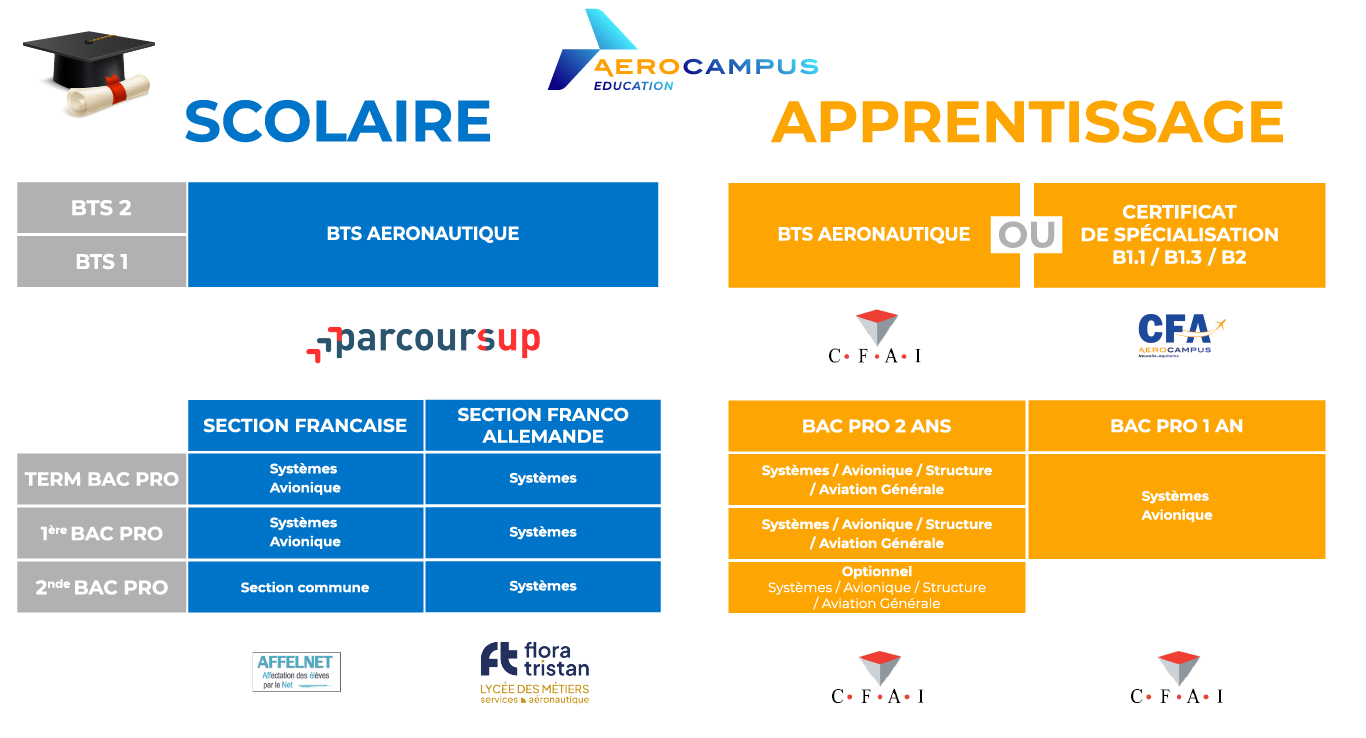Sur AEROCAMPUS, nous formons les futurs mécaniciens et techniciens en maintenance Aéronautique. Accessibles après la 3ème et post BAC, nos formations BAC PRO et BTS sont proposées en apprentissage (en partenariat avec le CFAI de Bruges) ou par voie scolaire (en partenariat avec le Lycée Flora Tristan de Camblanes) pour s’adapter à tous les profils et permettent des poursuites d’études en Licence Professionnelle ou en Master pour ceux qui le souhaitent. Nos Certificats de Spécialisation B1.1, B1.3 ou B2 sont proposés en apprentissage au sein de notre propre CFA. Nous proposons également une formation spécialisée dans la maintenance des drones dont l’utilité est de plus en plus prégnante tant dans le domaine civil que militaire.